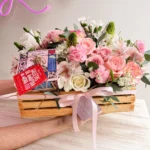 – Caja de madera con un arreglo de variedad de flores frescas