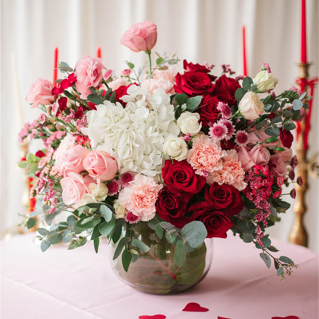 Arreglo de flores frescas variadas en un florero de vidrio tipo bowl.