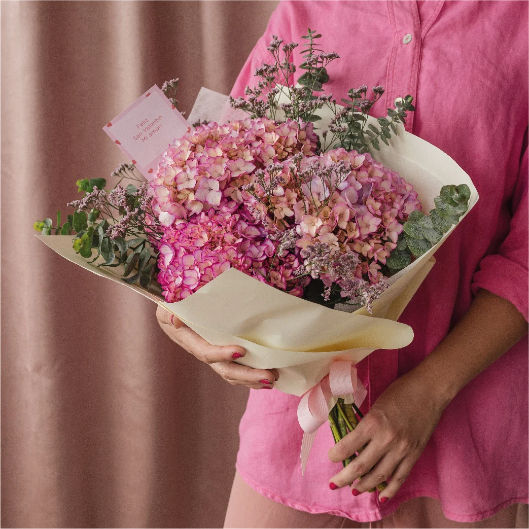 Bouquet de 3 HORTENSIAS frescas, con toques de follajes.