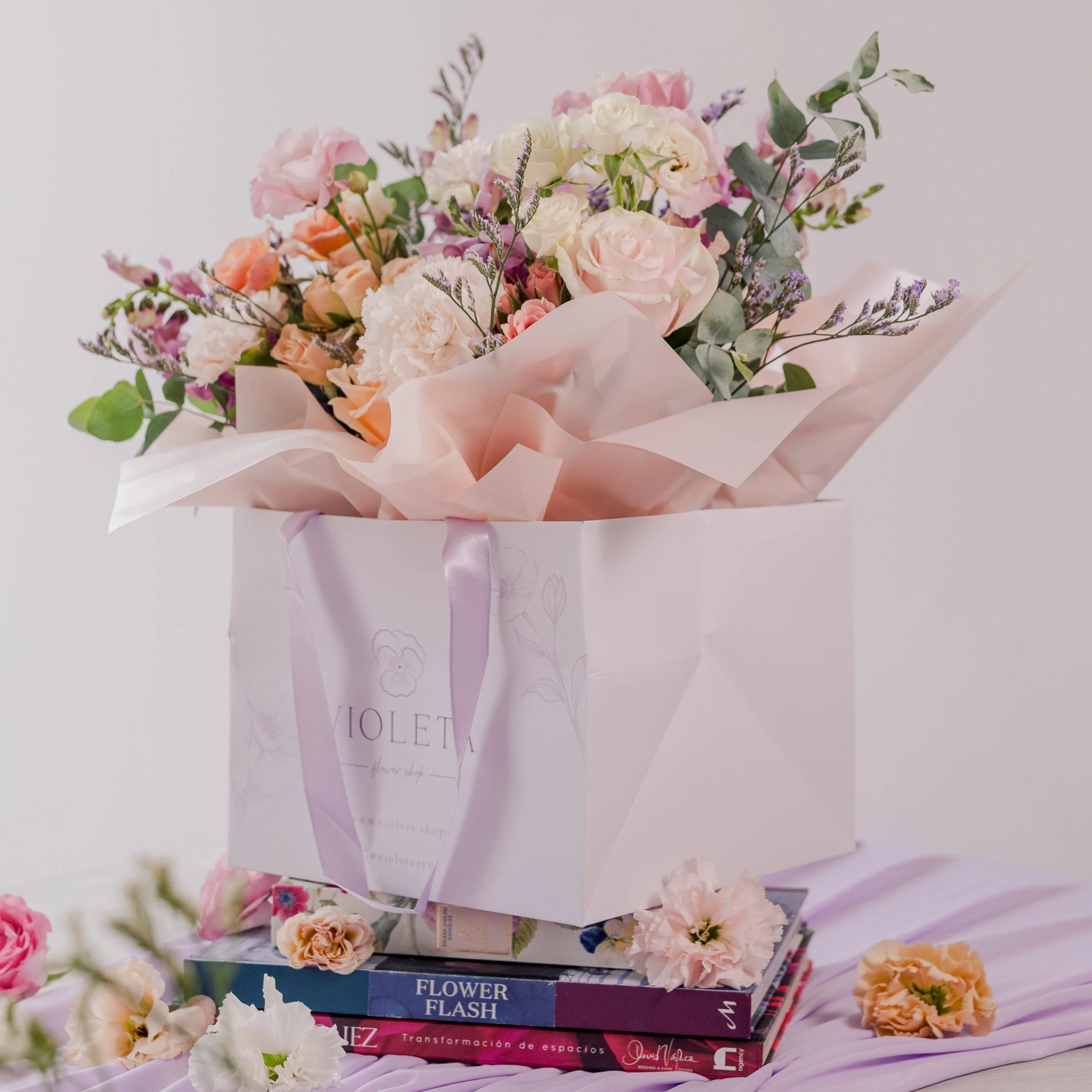 Bouquet de flores variadas en espuma floral con envoltura y shopping bag