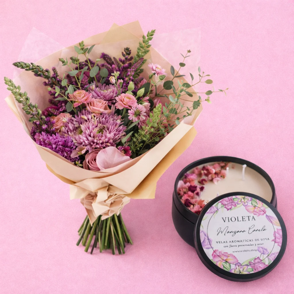 Bouquet de variedad de flores y follajes variados. 3 tamaños disponibles según la cantidad de tallos + Una vela de lata con olores riquísimos!
