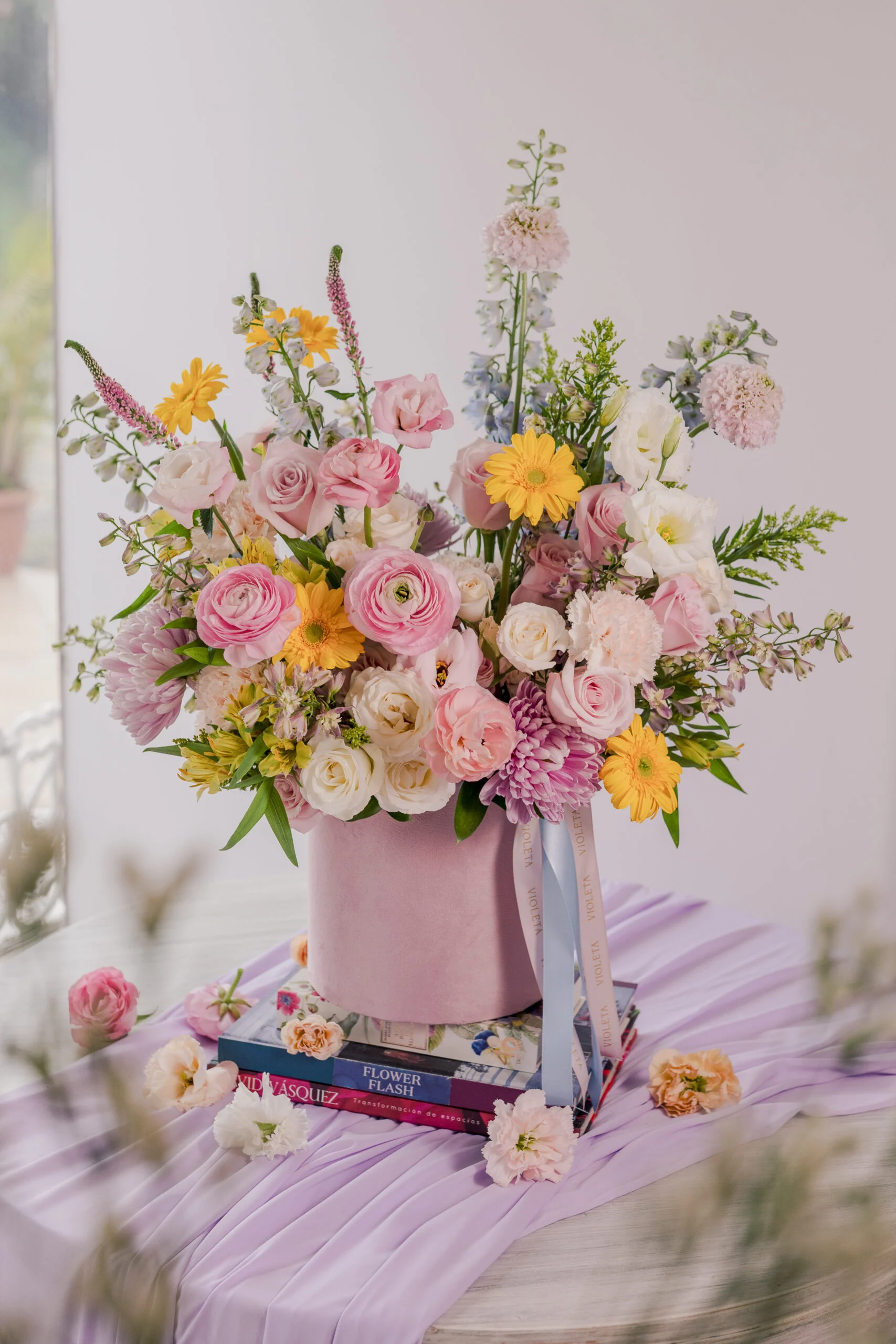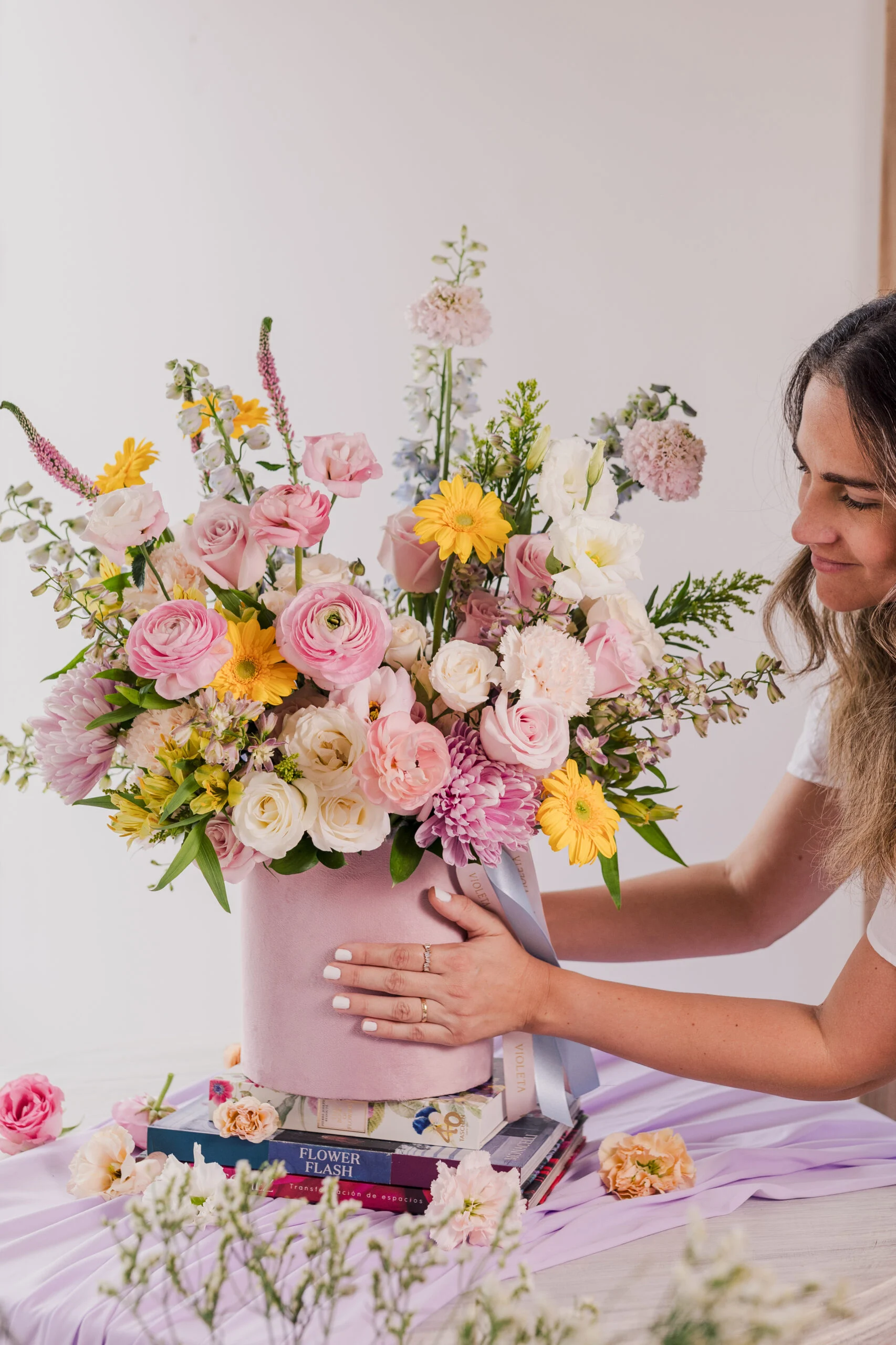 en tonos primaverales en una base tipo velvet rosada.