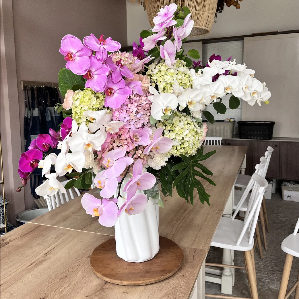 Arreglo de variedad de flores frescas como hortensias, rosas de jardín y orquídeas y follajes. En una base alta de vidrio blanco o transparente.