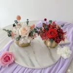 Arreglo de flores preservadas en base dorada, con rosa, hortensia, gypsophila,