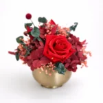 Arreglo de variedad de rosas rojas y eucalipto en una base con acabado dorado.