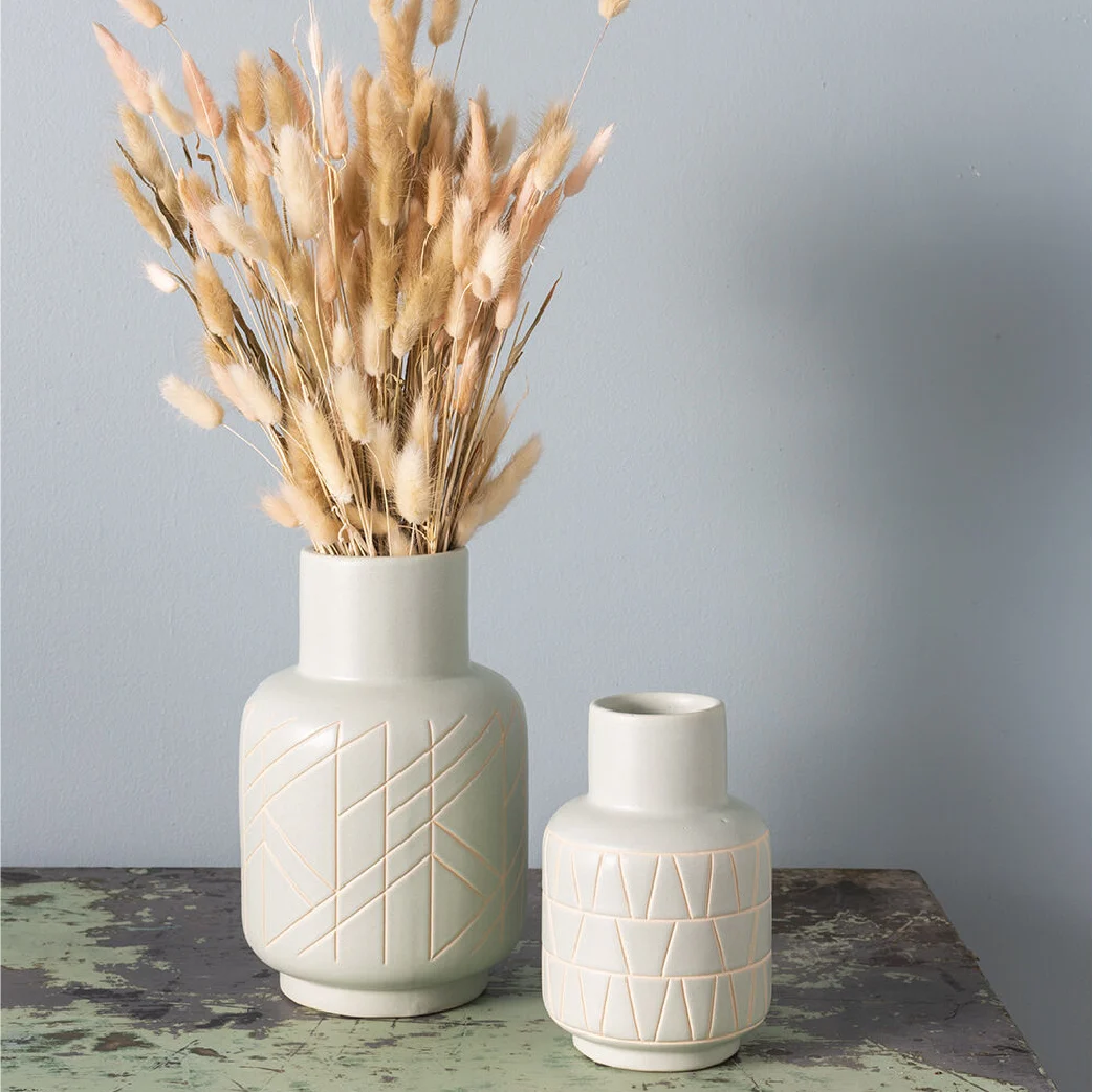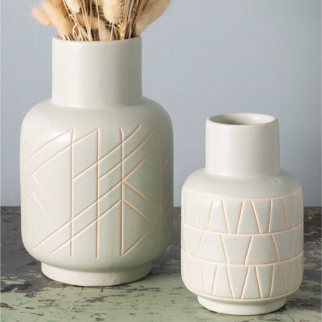 La colección Joyful en tonos MENTA, con un patrón de líneas grabadas alrededor del cuerpo. Estas piezas de loza (material cerámico hecho de arcilla blanca) se pueden usar en cualquier época del año para realzar tus espacios.