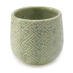 Florero de cerámica en un tono verde menta, con patrón de diseños geométricos en relieve.